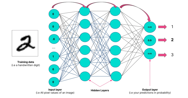 Enfin, dans la couche de sortie, le réseau donne une série de valeurs qui sont interprétées comme des probabilités. Par exemple, pour un modèle de reconnaissance d’image, chaque sortie correspond à une catégorie possible (ex. : chiffre de 0 à 9), et le chiffre avec la probabilité la plus élevée est celui prédit par le modèle.