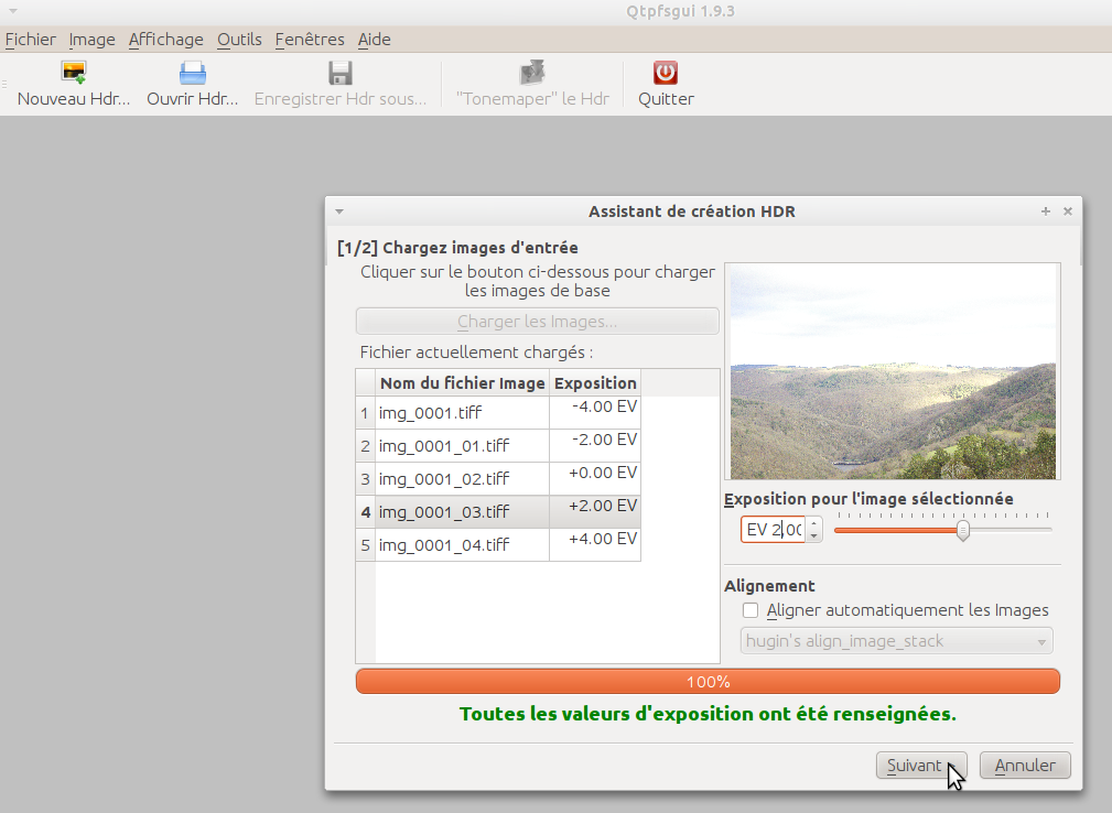 Une fois que c’est chose faite, on arrive à un écran nous permettant de caler les différentes vues entre elles. Si on à juste « développé » plusieurs fois la même photo il n’y a rien à faire. Sinon, il faut ajuster les différentes photos pour qu’elles se superposent parfaitement. Sous Linux on peut utiliser HDRprep (utilitaire en ligne de commande) mais ne l’ayant jamais utilisé je ne sais pas comment il fonctionne…